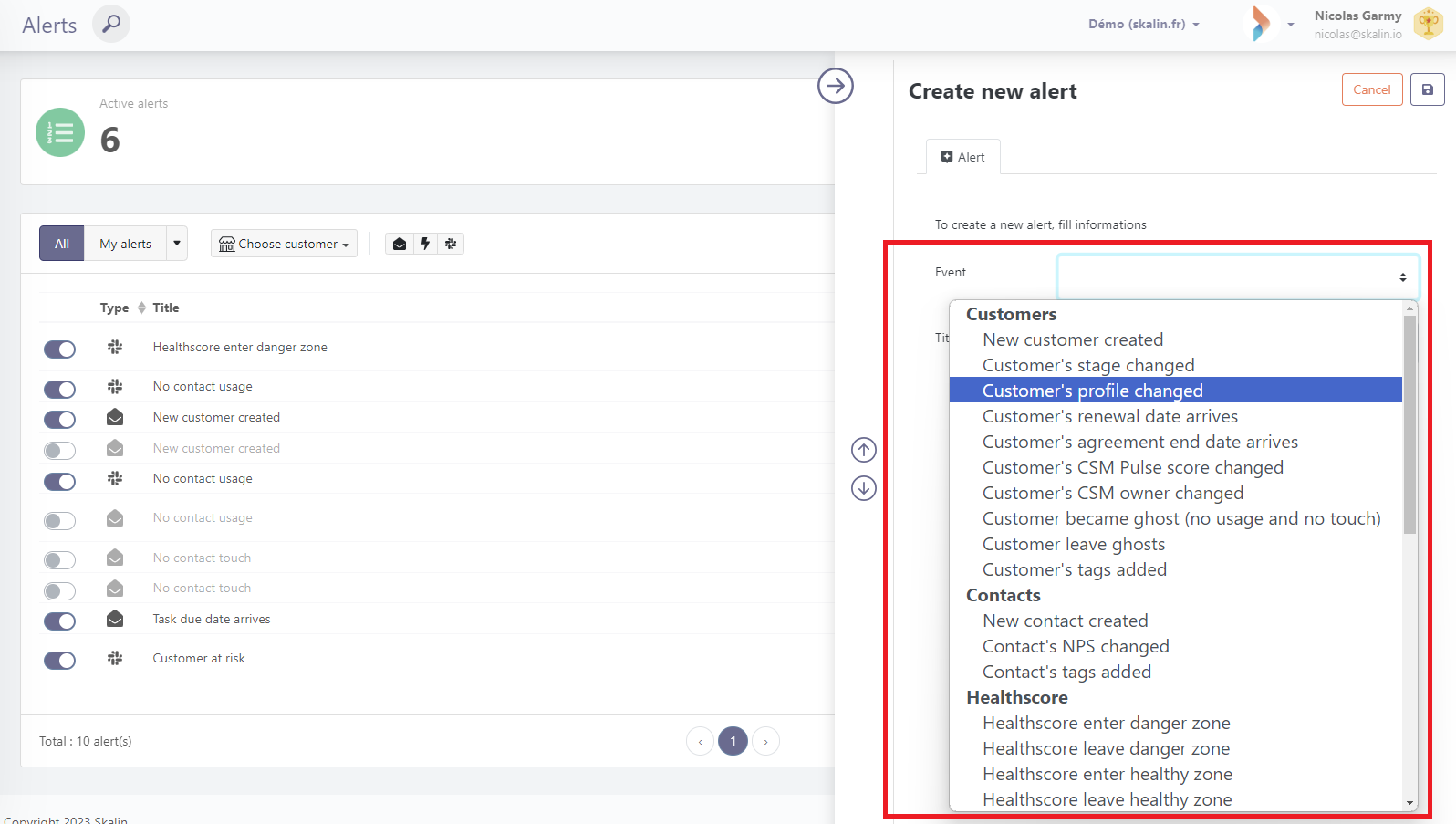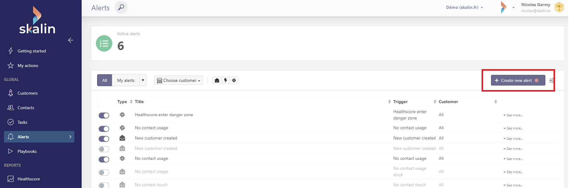 To create an alert, go to "Alerts" in the vertical menu, then click on "Create new alert".
